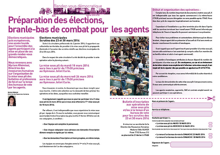 Ici en double page, un contenu ingrat mais nécessaire, pour inciter les agents de la ville à la mise sous plis pour les élections.